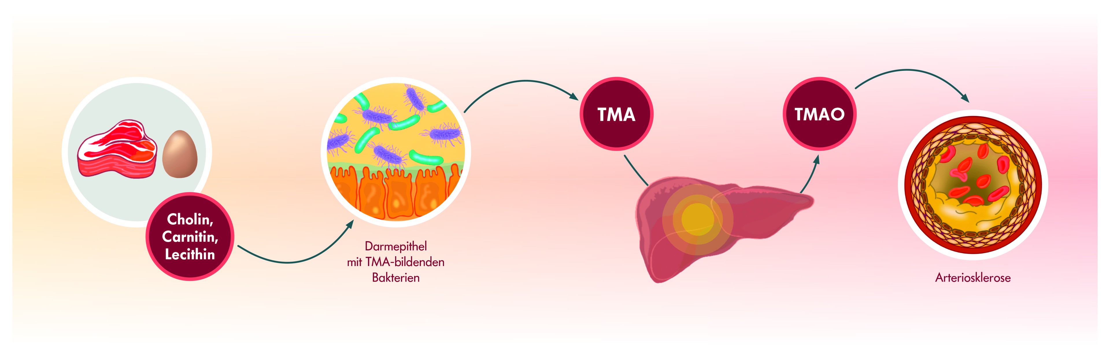 Systemisches Trimethylamin-N-oxid (TMAO) ist ein Schlüsselmolekül der Atherogenese: Es beeinflusst den Cholesterin- und Gallensäurestoffwechsel und treibt Entzündungen der Gefäßwand voran. Vorläufer ist das ausschließlich bakteriell gebildete TMA, das beim Abbau von z.B. Phosphatidylcholin und L-Carnitin entsteht. TMA wird in der Leber mittels Enzymen rasch zu TMAO oxidiert. Erhöhte TMAO-Spiegel sind mit einem höheren Risiko für kardiovaskuläre Erkrankungen assoziiert – insbesondere Herzinfarkt und Schlaganfall. TMAO steigert die Konzentration des Makrophagen-spezifischen Cholesterins und die Bildung von Schaumzellen in der arteriellen Gefäßwand.