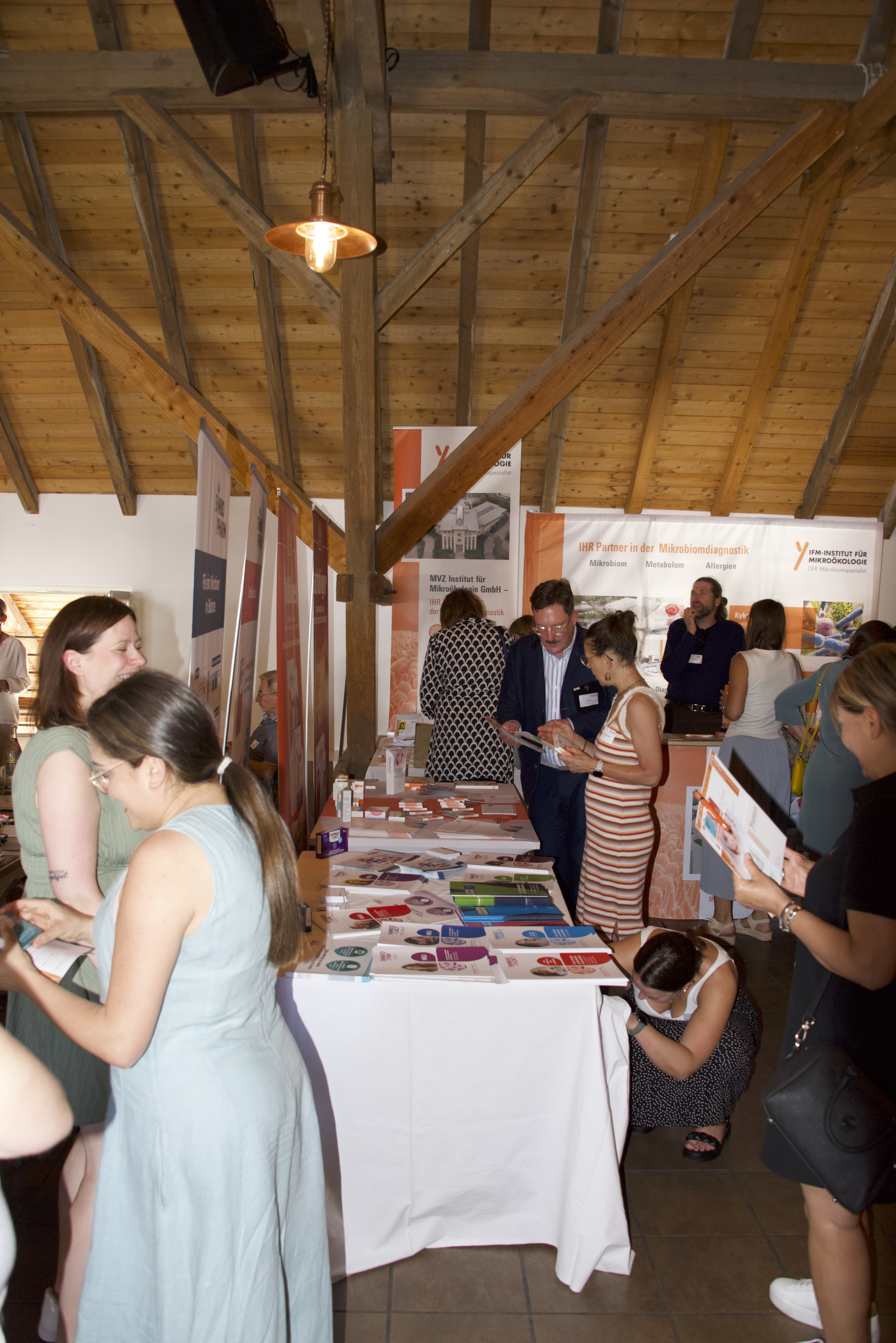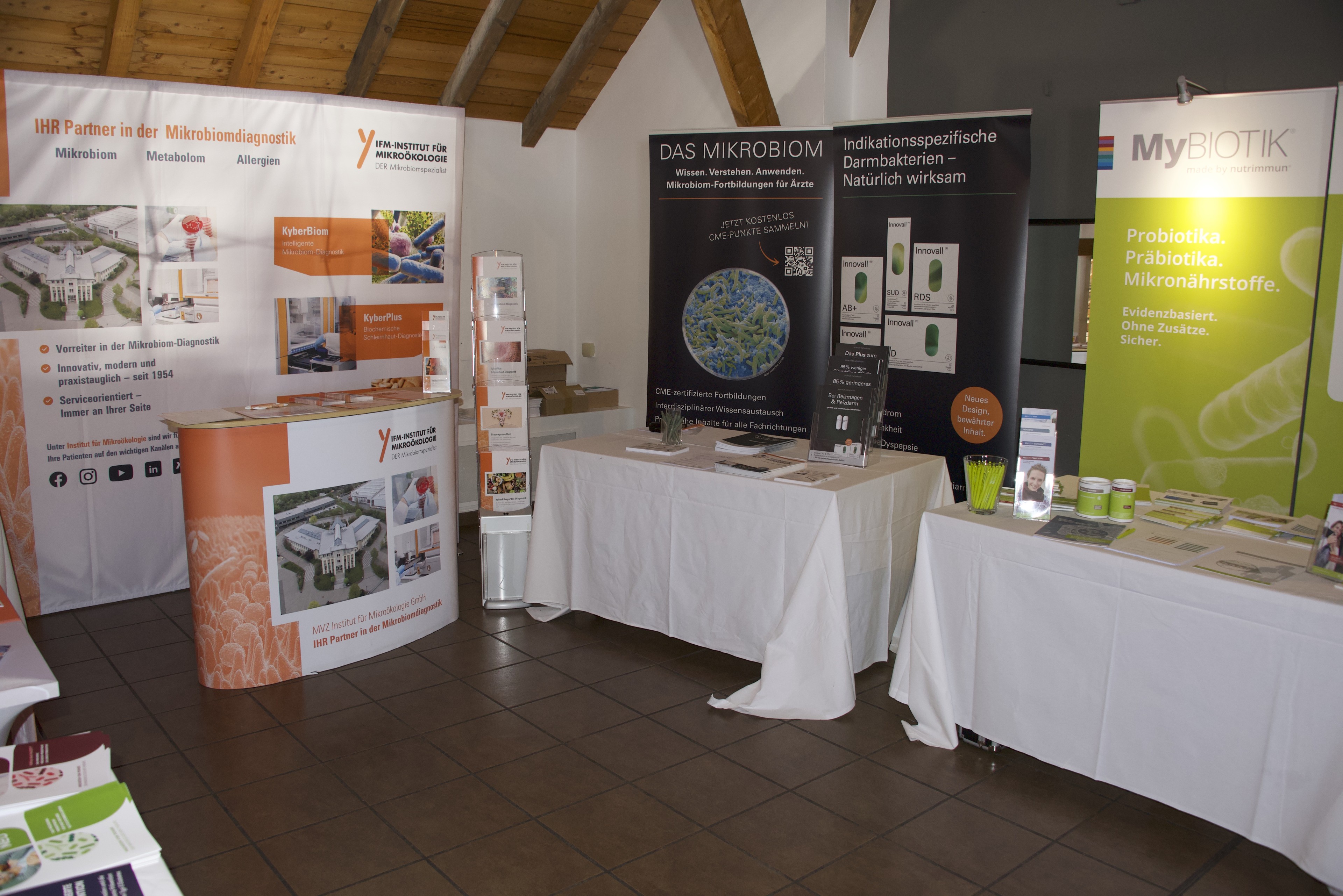 Am Samstagmorgen begrüßte Prof. Dr. rer. nat. Andreas Schwiertz alle Teilnehmenden mit einer kurzen Einführung in das Thema und das diesjährige Programm. Er stellte zudem die Aussteller der kleinen Industriemesse vor. Hier hatten die Teilnehmenden die Möglichkeit sich über probiotische Produkte und die Mikrobiomdiagnostik zu informieren. Kemja Metz und Malte Burkert vom IfM-Außendienst betreute den IfM-Stand vor Ort.