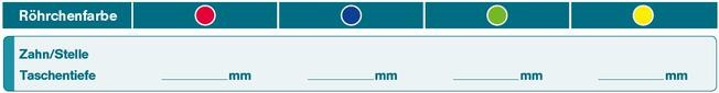 Wenn Sie vier subgingivale Proben separat messen lassen möchten, geben Sie die Papierspitzen bitte nach der Probenentnahme einzeln in die verschiedenen, farbigen Röhrchen. Tragen Sie anschließend die Farben auf dem Auftragsformular ein.