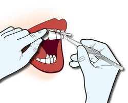 Akut blutende Taschen - zum Beispiel nach einer Sondierung - oder stark eiternde Stellen sind dagegen nicht geeignet. Blut und Eiter erhöhen den Anteil humaner DNA im Probenmaterial und verdünnen damit die bakterielle DNA. Außerdem können inhibitorische Stoffe aus Blut und Eiter die Analyse negativ beeinflussen.