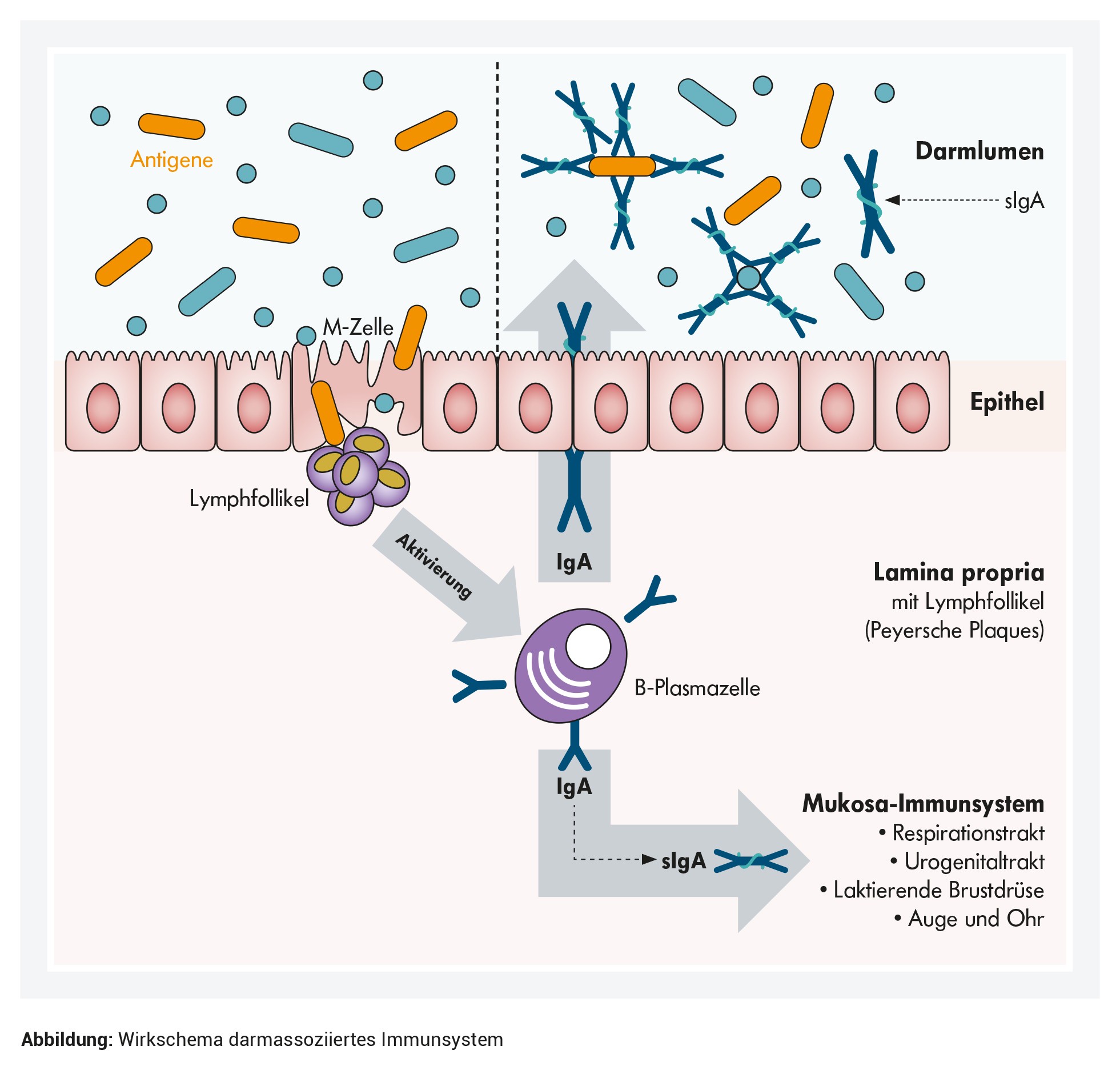 Mit dem sekretorischen IgA beteiligt sich das adaptive Immunsystem am Schleimhaut-Schutz: Bei Gesunden regen Antigene wie Bakterien oder Nahrungsbestandteile die Bildung des IgA in den B-Zellen an. Die M-Zellen der Darmschleimhaut transportieren dafür Antigene durch das Epithel zum darunterliegenden Lymphgewebe. Oder spezialisierte dendritische Zellen „greifen“ zwischen den Epithelzellen hindurch und "nehmen Proben" aus dem Lumen. Das regt die Entwicklung IgA-bildender B-Plasmazellen an (1,2). Die dendritischen Zellen bilden zusätzlich das Enyzm Stickoxidsynthase, das die B-Plasmazellen umprogrammiert. In der Folge produzieren sie später IgA - statt anderer Antikörperklassen (3). Das IgA macht mit etwa 15 Prozent einen bedeutenden Anteil aller Immunglobuline im Körper aus (4).