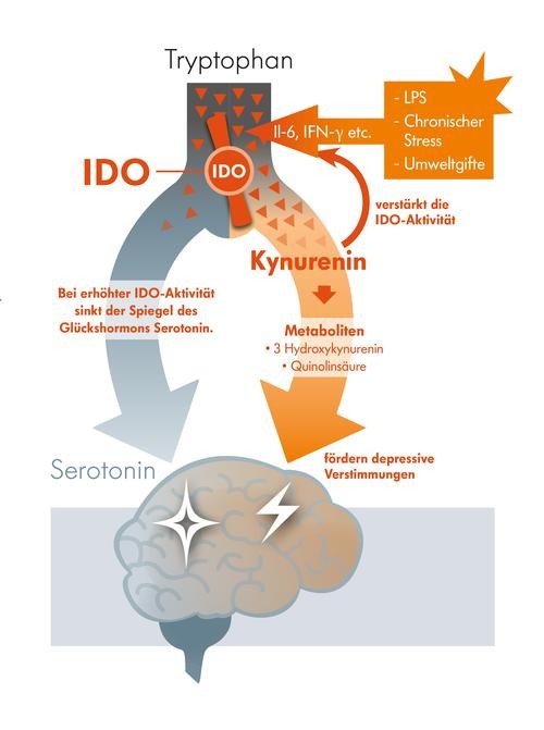 Eine erhöhte IDO-Aktivität begünstigt depressive Verstimmungen auf zwei Wegen: über den Mangel des Glückshormons Serotonin und über die depressionsfördernden Stoffwechselprodukte 3-Hydroxykynurenin und Quinolinsäure.